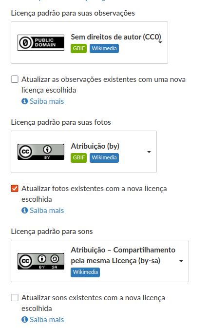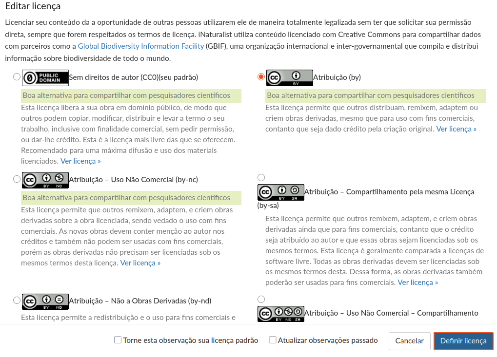 Você pode escolher uma licença diferente em cada caso. Ao escolher uma licença, ela ficará ativa somente para as observações futuras. Você pode aplicar a licença de forma retroativa ao clicar na caixa “Atualizar fotos existentes com a nova licença escolhida”.