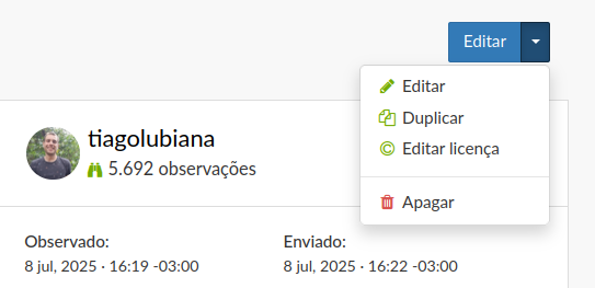 Uma parte especialmente confusa é que na página da observação você muda apenas a licença dos metadados. Para fazer isso, é preciso clicar no topo direito, na setinha ao lado de “Editar”, você pode clicar em Editar licença.